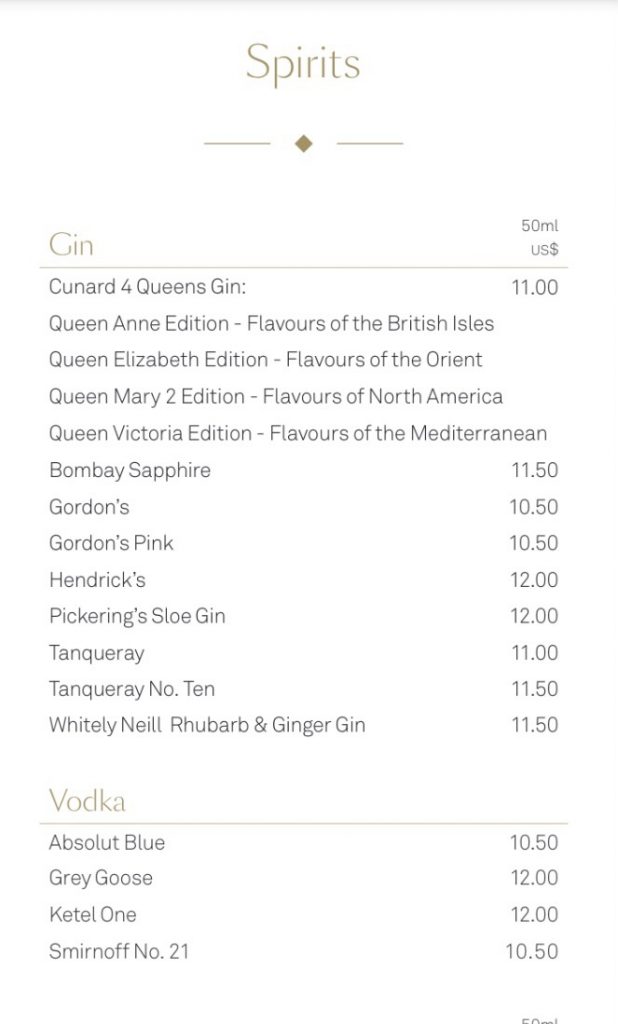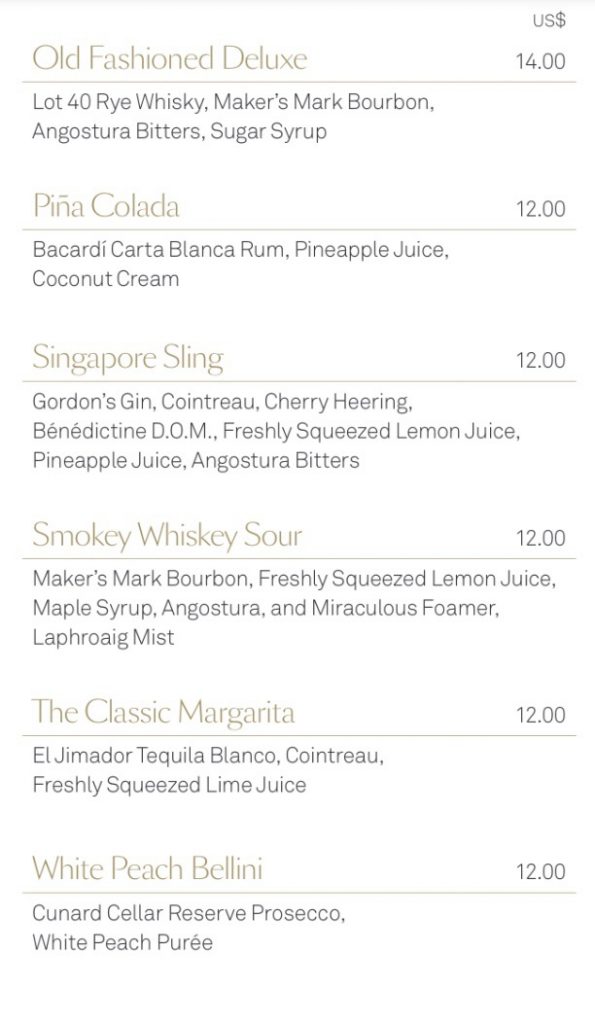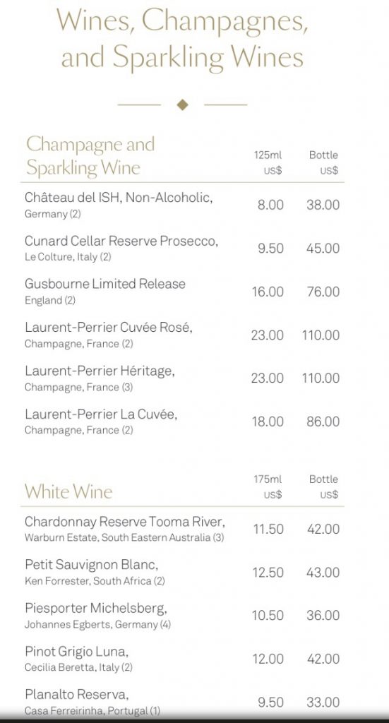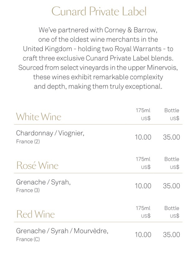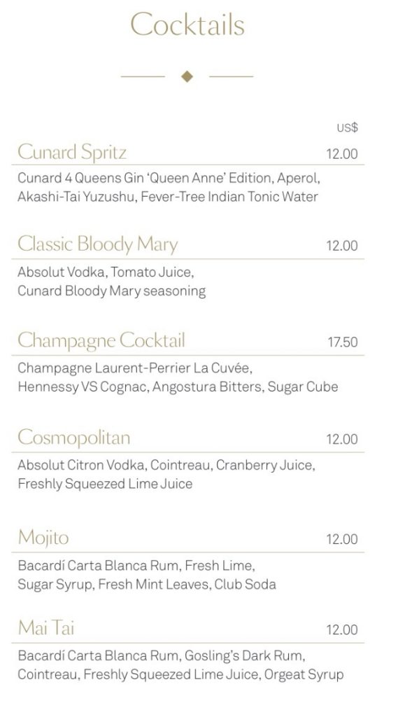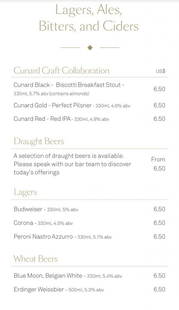 Cunard has always positioned itself at the premium end of the market, and the drink prices reflect that — but not in a way that feels unreasonable for a luxury line. Expect classic cocktails to sit in the $12-$14 range, with signature serves and more complex mixes nudging slightly higher. Wine by the glass starts around $9.50, with a broad selection climbing into the $12–$15 bracket depending on varietal and region. Beer lovers will find pints typically between $6.50 and $7.50, with bottled options priced similarly.