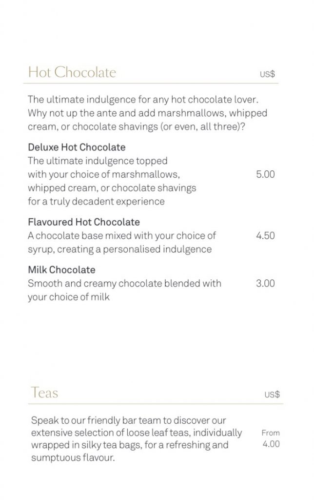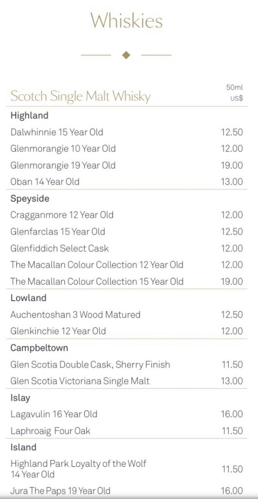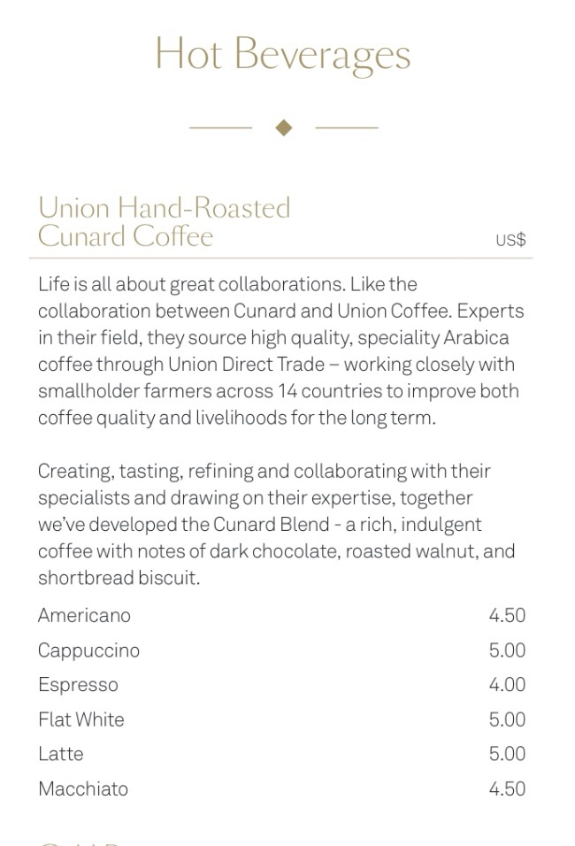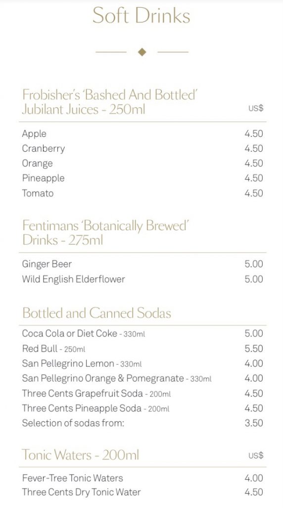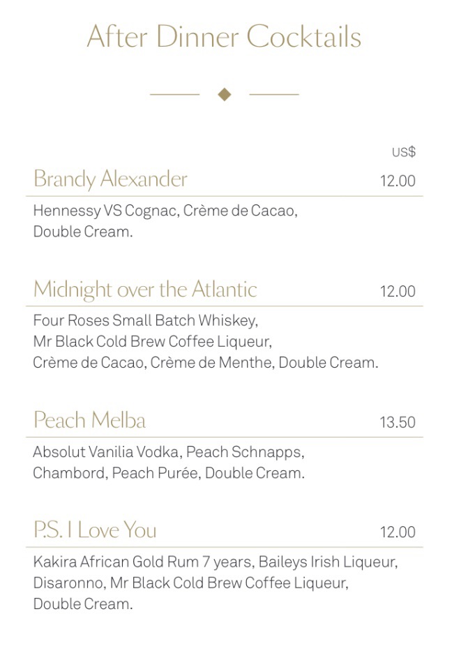 Cunard has always positioned itself at the premium end of the market, and the drink prices reflect that — but not in a way that feels unreasonable for a luxury line. Expect classic cocktails to sit in the $12-$14 range, with signature serves and more complex mixes nudging slightly higher. Wine by the glass starts around $9.50, with a broad selection climbing into the $12–$15 bracket depending on varietal and region. Beer lovers will find pints typically between $6.50 and $7.50, with bottled options priced similarly.