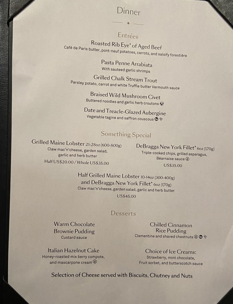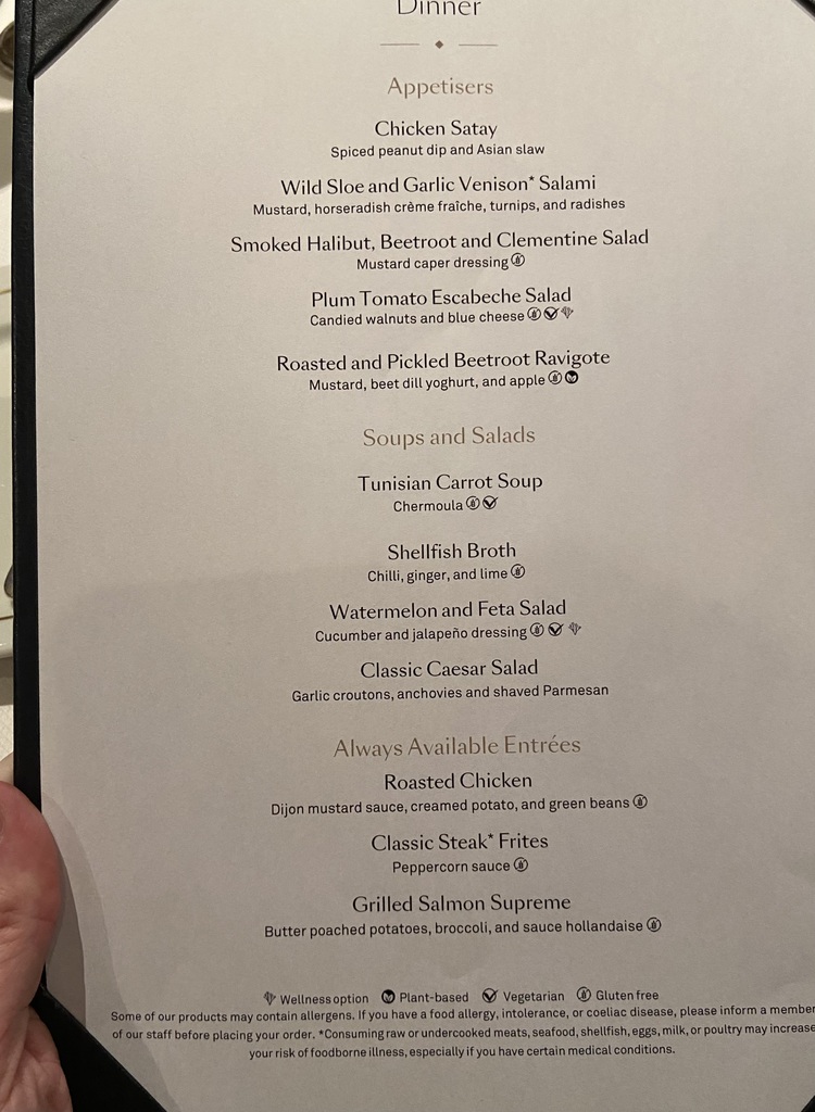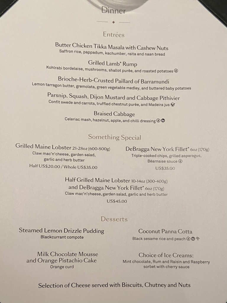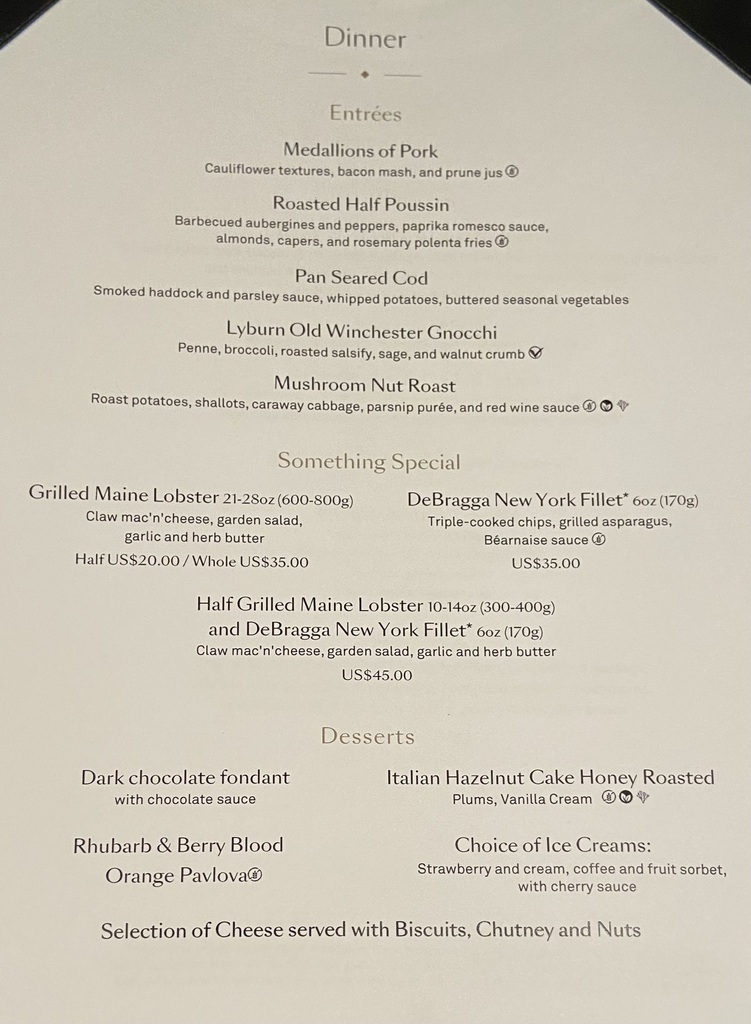 Dinner in the main dining room always had a sense of occasion. The menus changed each evening, it’s clear that Cunard still values the ritual of a proper sit‑down dinner.