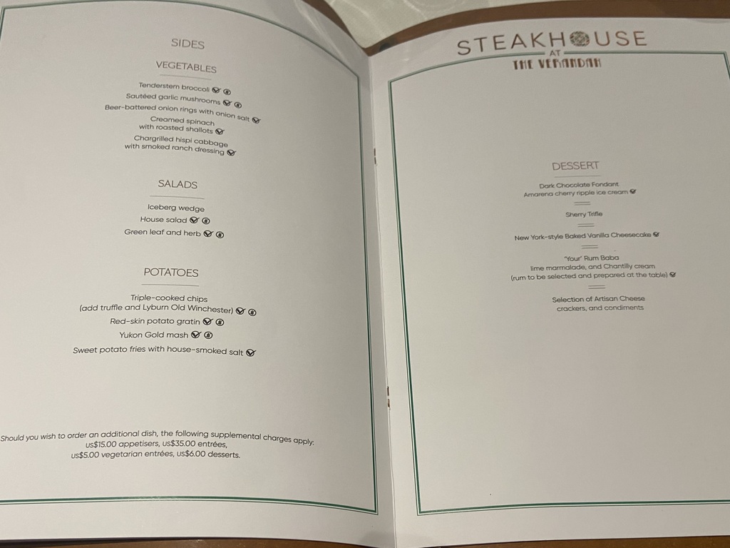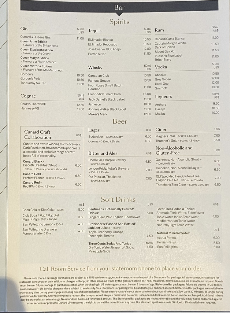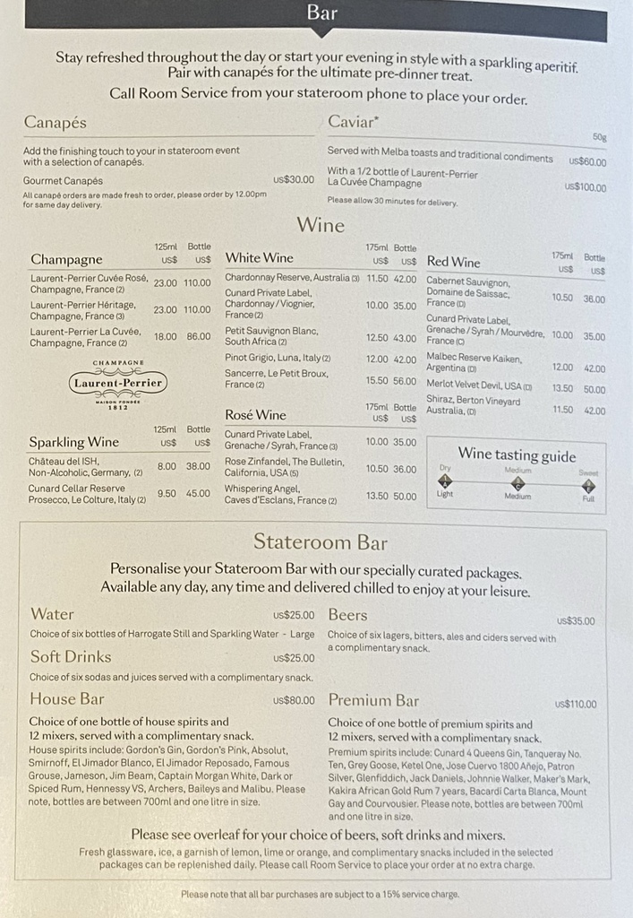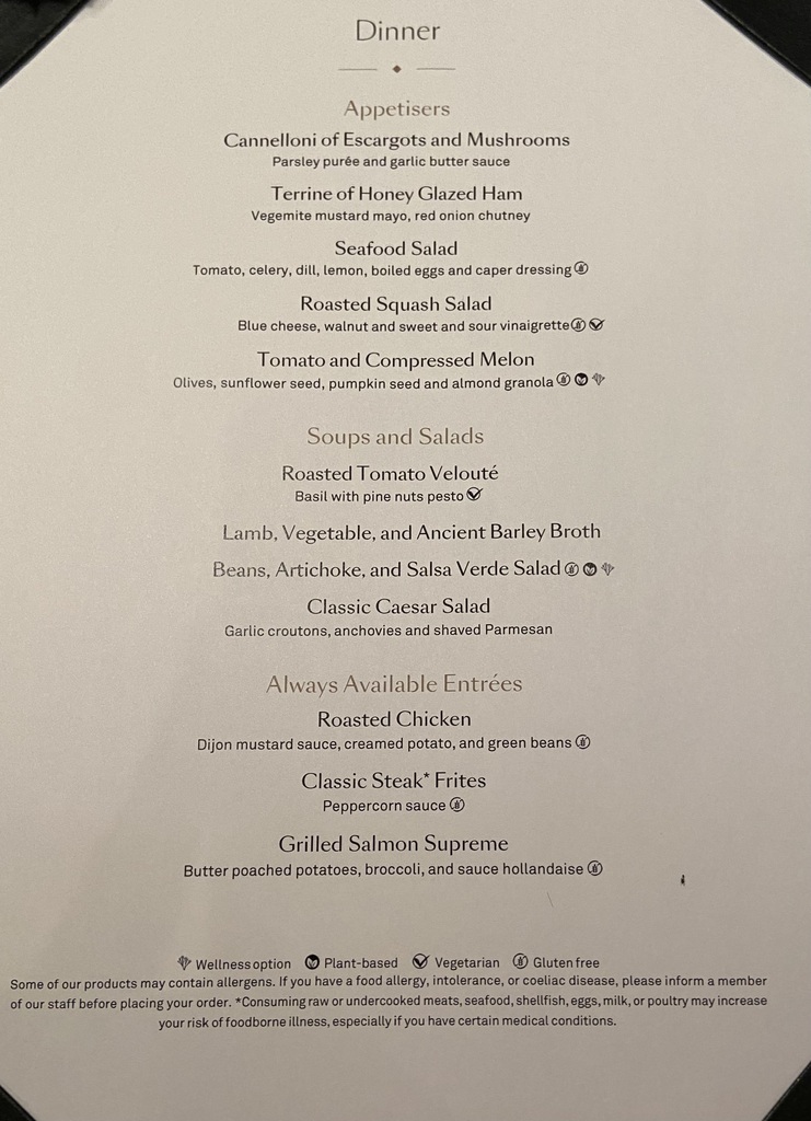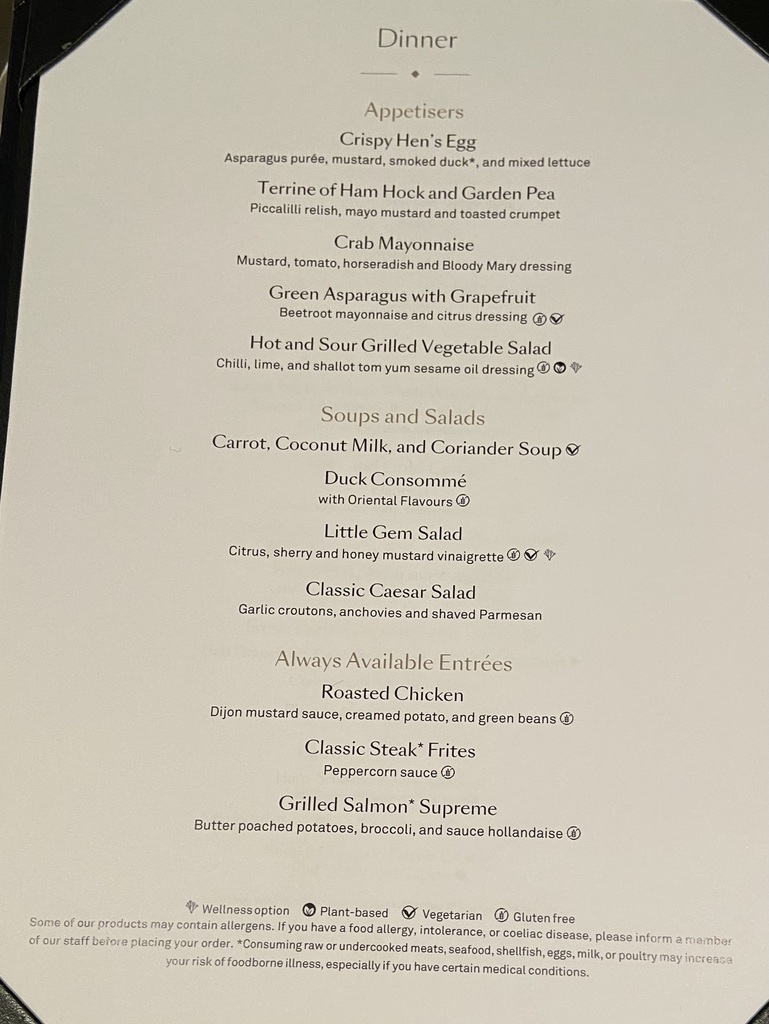 Dinner in the main dining room always had a sense of occasion. The menus changed each evening, it’s clear that Cunard still values the ritual of a proper sit‑down dinner.