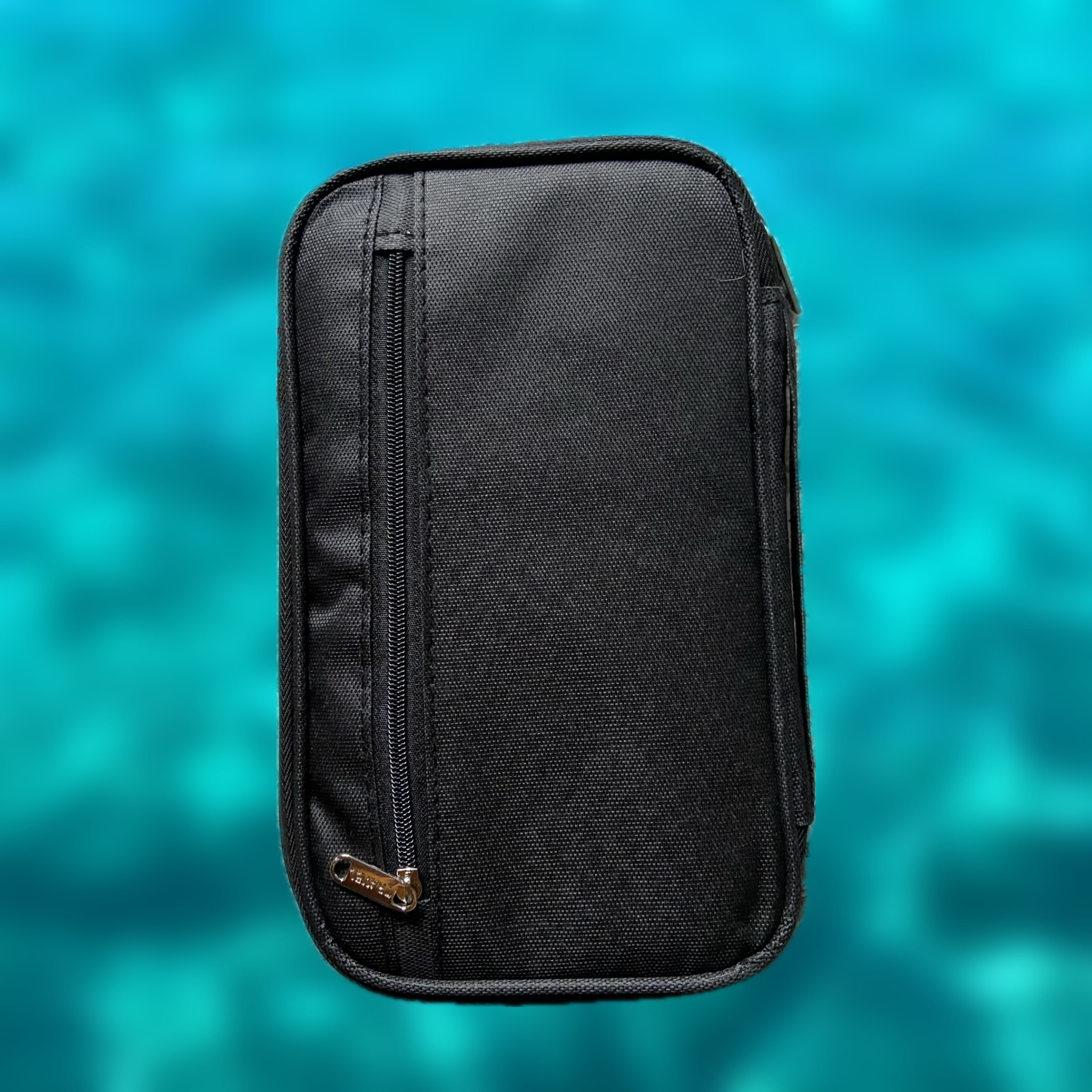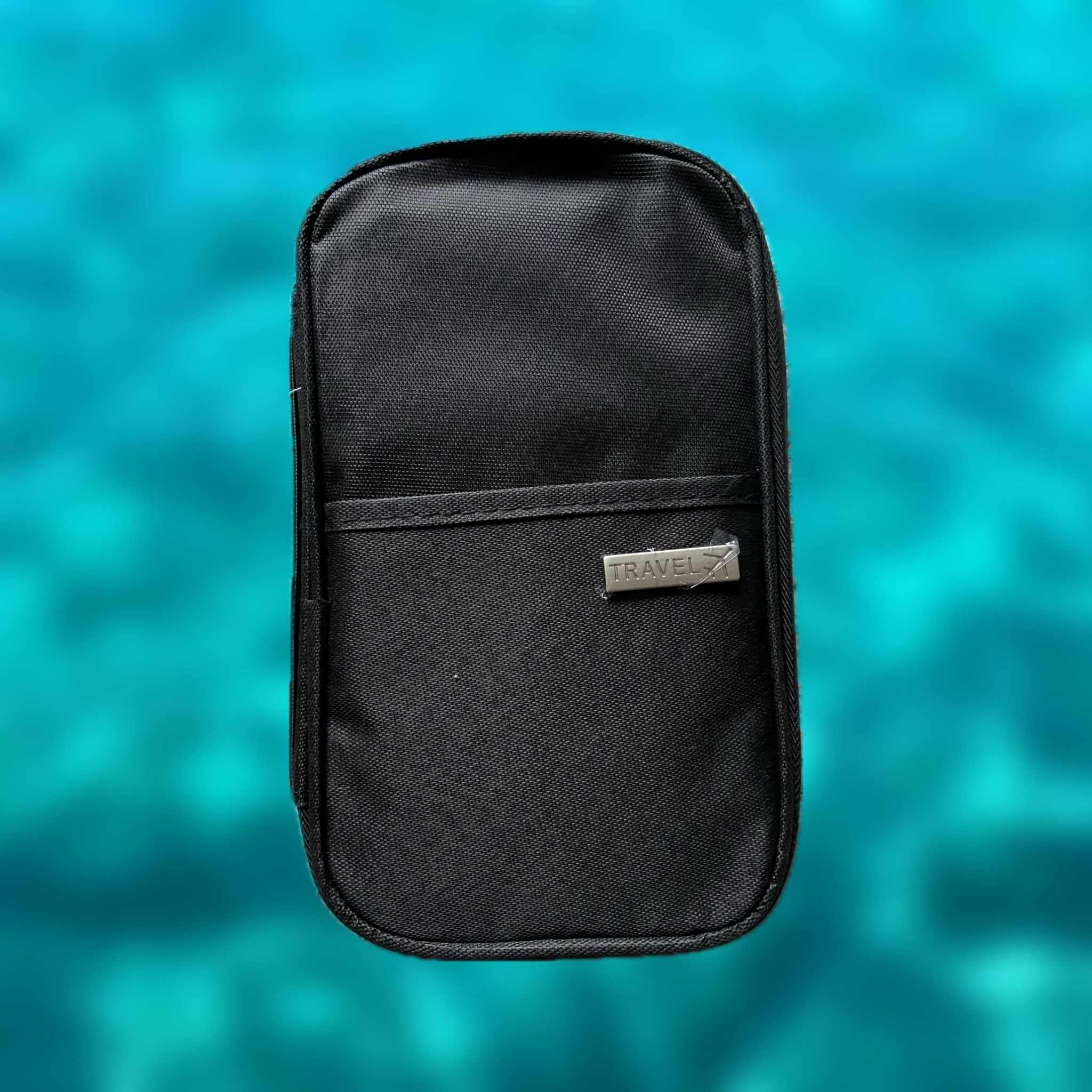 The travel organiser comes in black and measures 22 × 14 × 2 cm. It includes a handy carry handle, a front pouch, and several internal compartments for passports, boarding passes, keys, a pen, and other small essentials. There’s also an extra pocket on the back for additional storage.