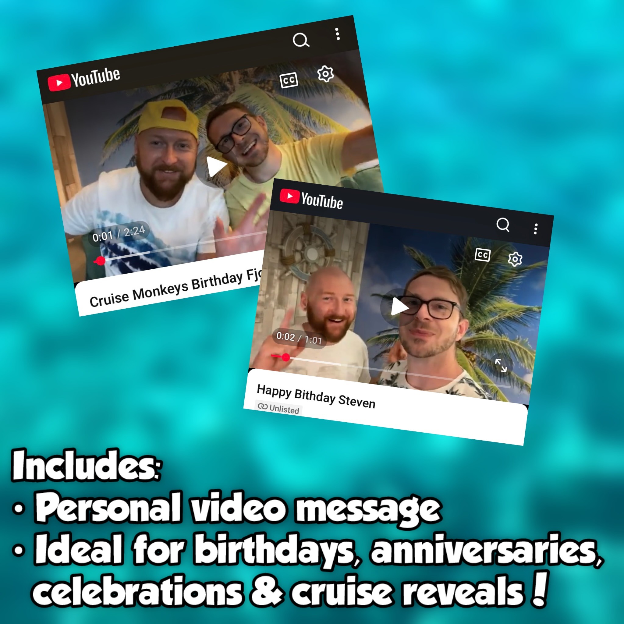 Once you’ve placed your order, simply complete the short form at: https://cruisemonkeys.com/celebrationform – we need 14 days notice, so do this ASAP after checking out, or contact us first. This gives us the details we need to create your personalised video message – if we need more information we will email you.